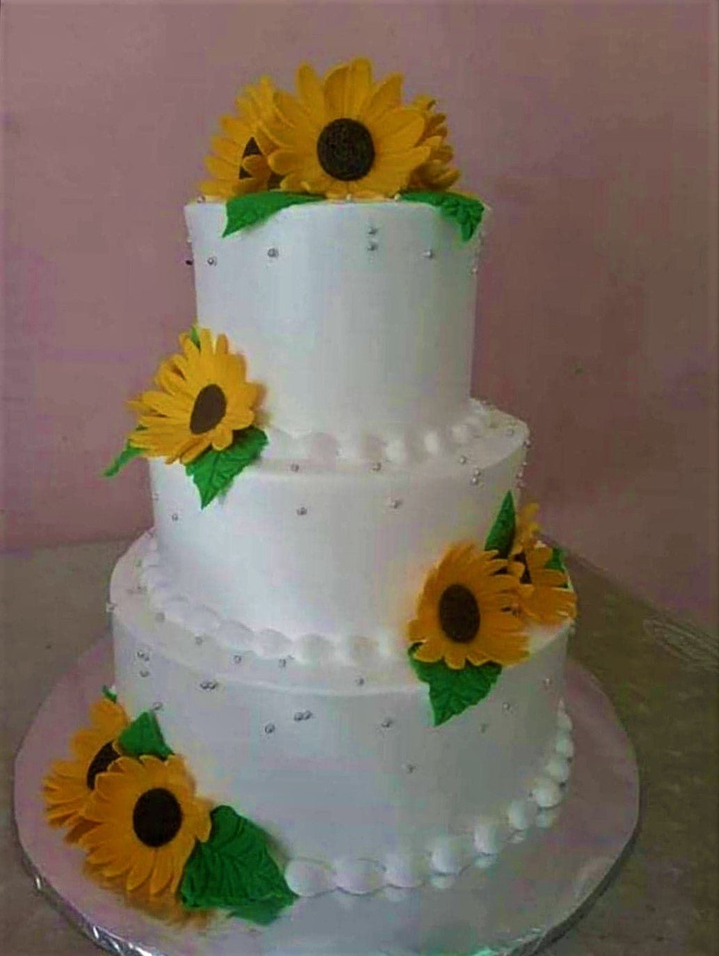 Three-tier white cake decorated with large yellow sunflowers and green leaves, accented with silver dragees.