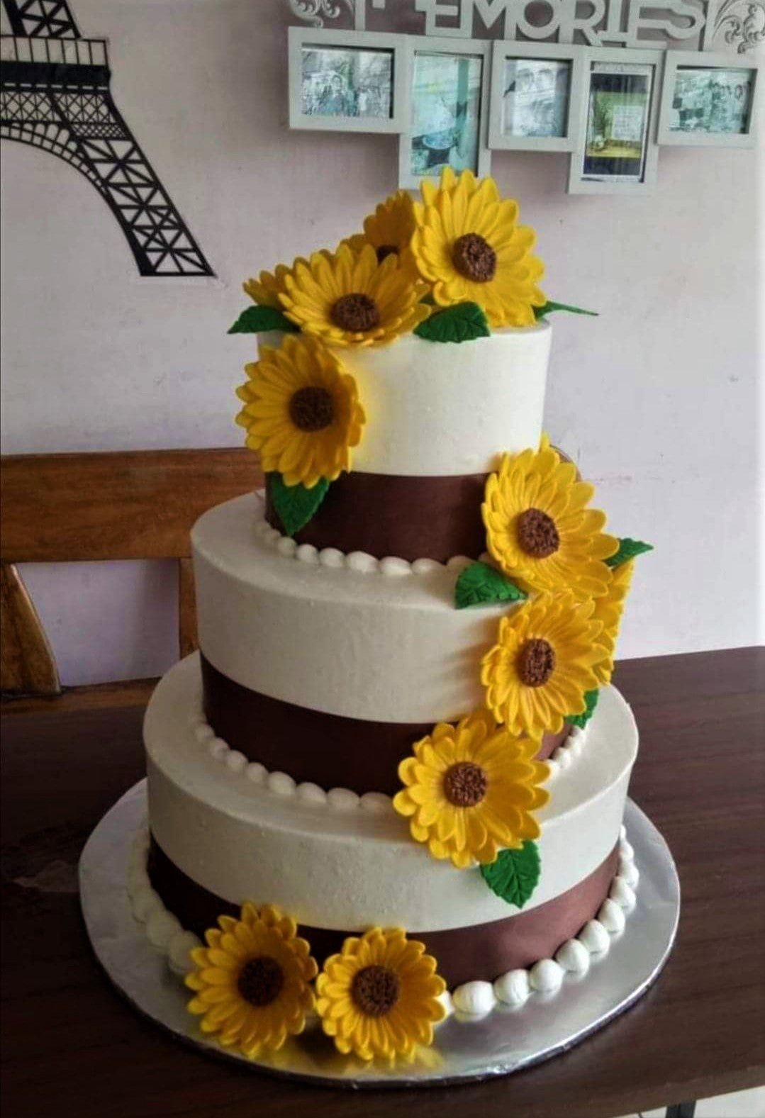 Three-tier white and brown sunflower cake with yellow gumpaste sunflowers and green leaves cascading down the sides.