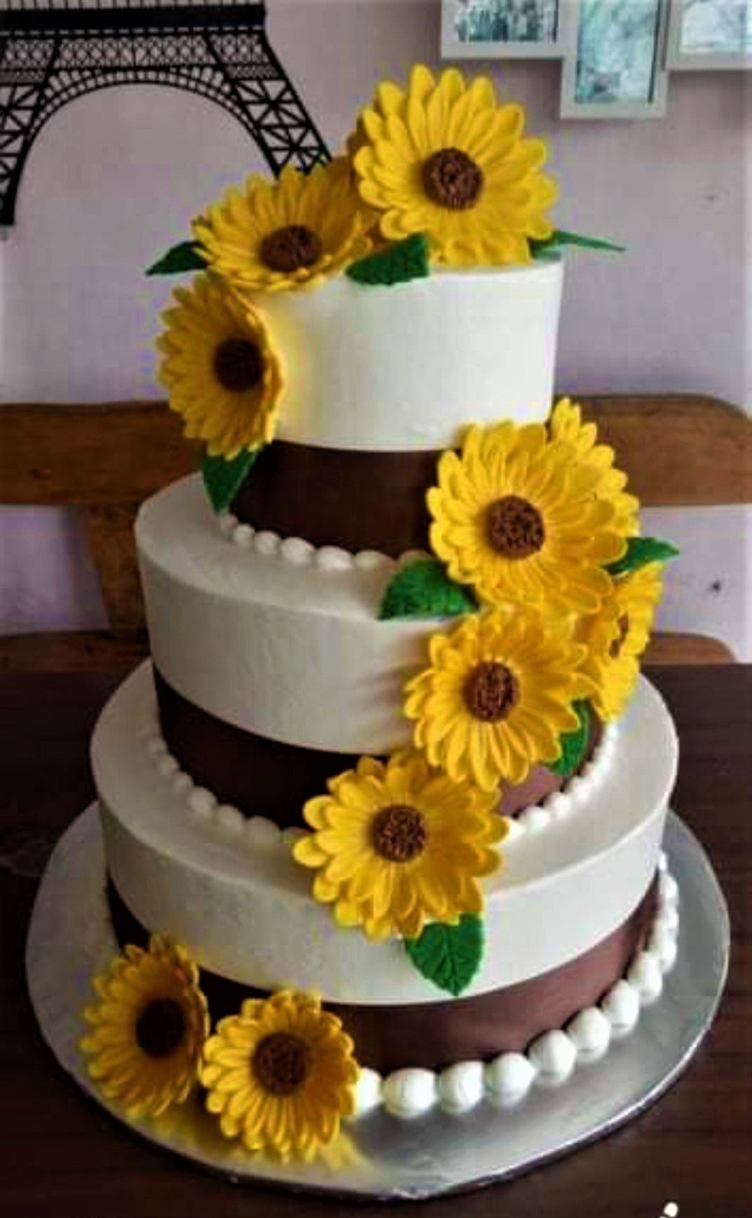 Three-tier white and brown sunflower cake with yellow gumpaste flowers and green leaves