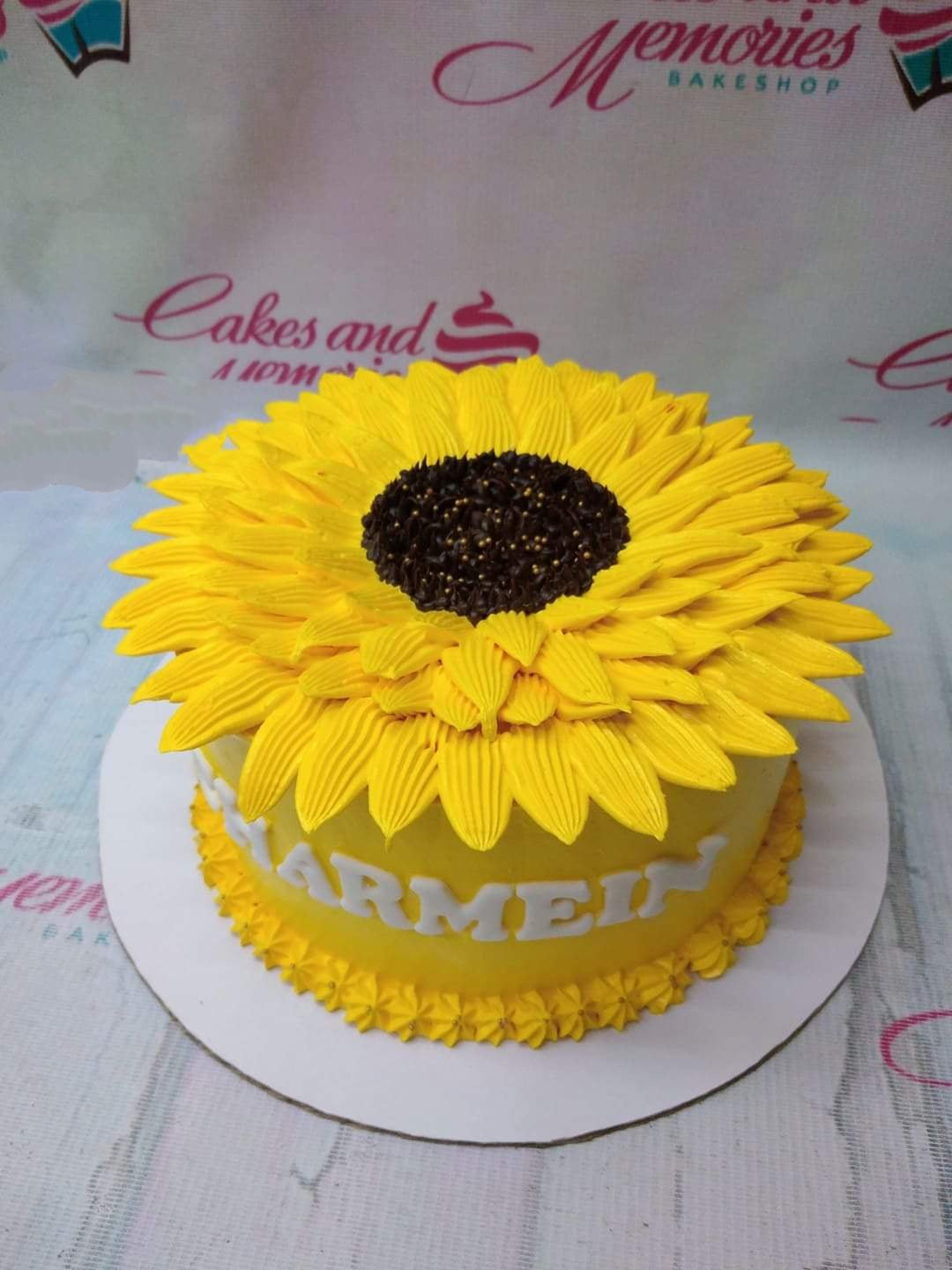 A single-tier yellow sunflower cake with intricate yellow icing petals and a dark brown center with gold sprinkles.
