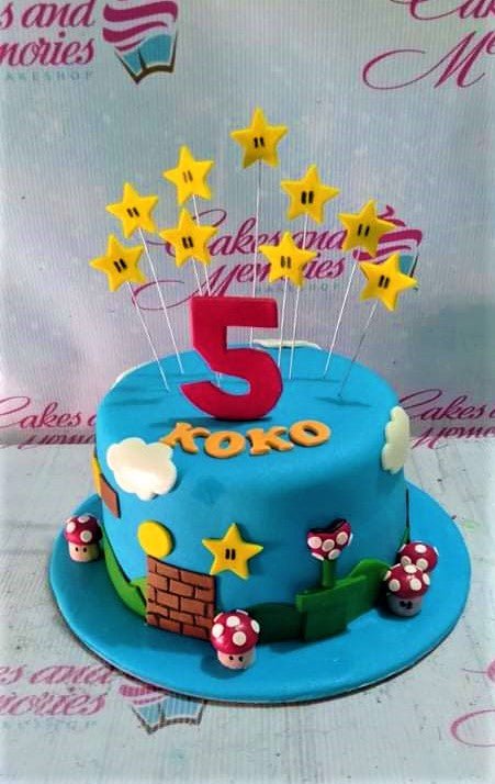 Blue Super Mario themed birthday cake with a large red number 5, yellow stars on wires, and fondant game elements like mushrooms and pipes.