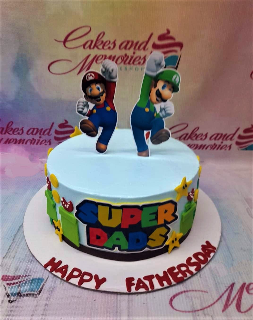 Light blue Super Mario and Luigi themed Father's Day cake with Super Dads logo and green pipes.
