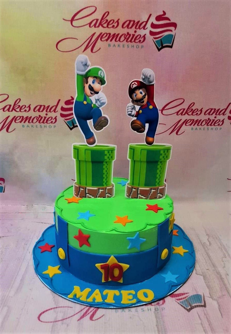 Super Mario and Luigi themed birthday cake with green pipes and colorful stars on a blue and green fondant base.