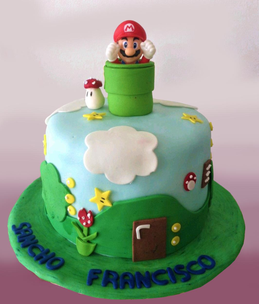 Super Mario themed 1-tier fondant cake with Mario in a green pipe topper, clouds, stars, and a mushroom on a green base board.