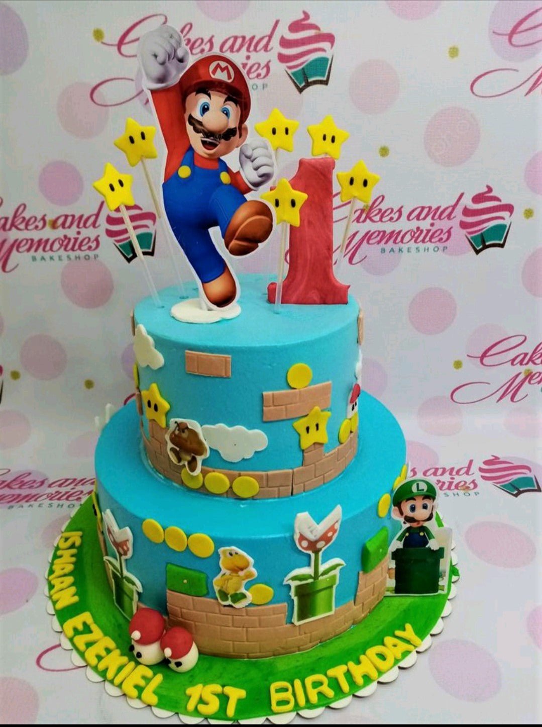 Super Mario themed 2-tier blue cake with character printouts, fondant bricks, gold stars, and a red number one topper.