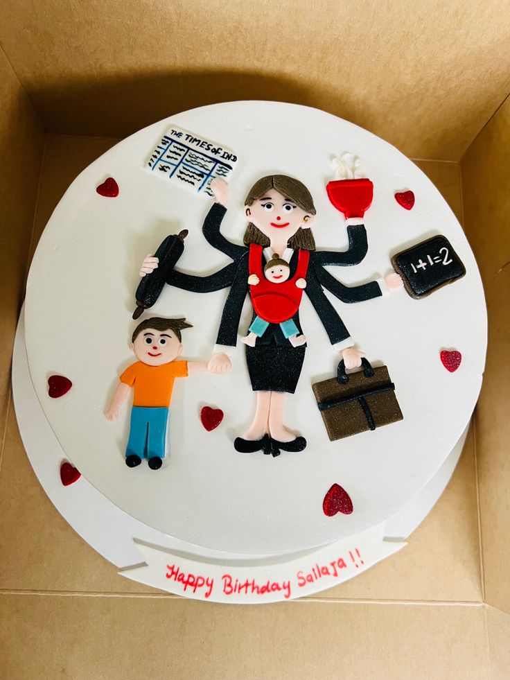 White round cake featuring a multi-tasking mother figure with several arms holding a baby, coffee, briefcase, and school supplies.