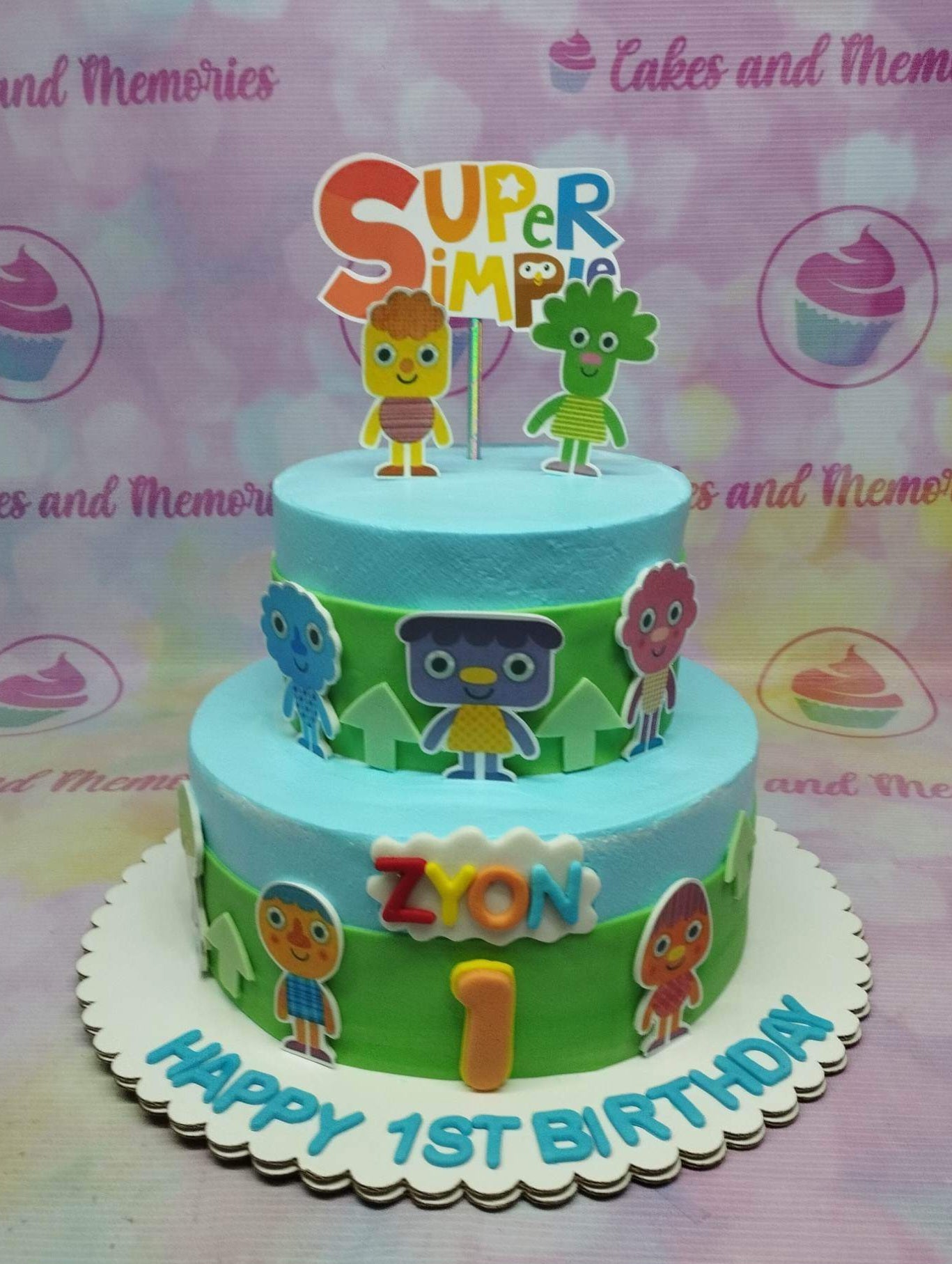 Two-tier Super Simple Songs themed birthday cake with light blue and green icing, featuring character printouts and a number one topper.