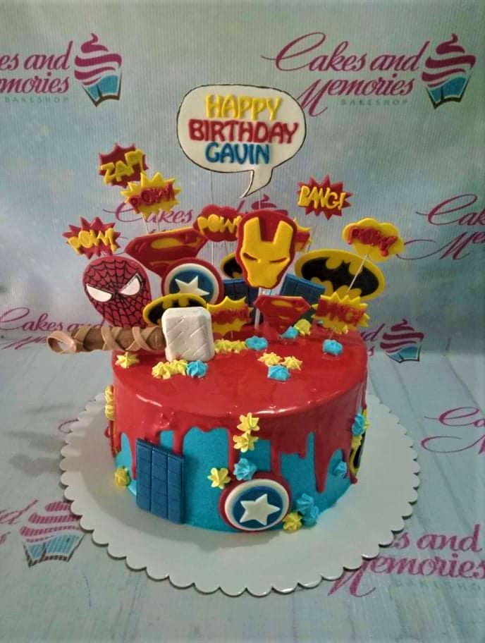 Superhero themed birthday cake with Spiderman, Iron Man, and Captain America toppers on blue icing with red drip.