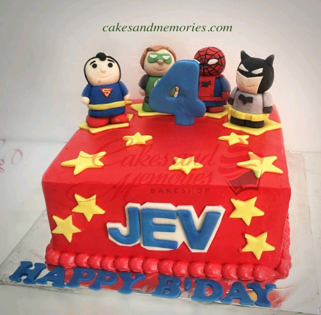 Red square superhero birthday cake with fondant figurines of Superman, Green Lantern, Spider-Man, and Batman, featuring yellow stars and a blue number 4.