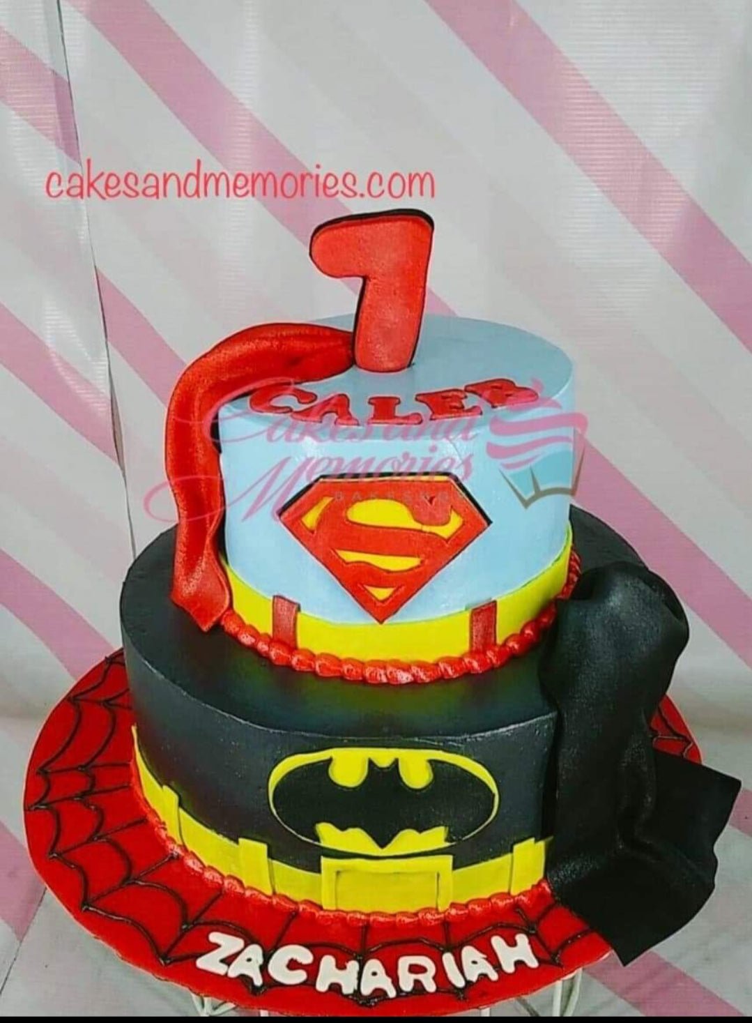 Two-tier superhero themed cake featuring Superman and Batman designs with a red number one topper and a red cape detail.