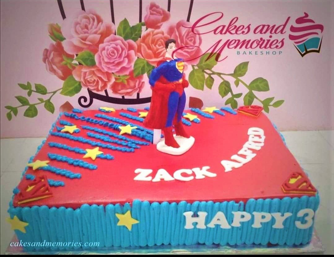Superman themed rectangle cake with red and blue icing, yellow stars, and a Superman figurine.