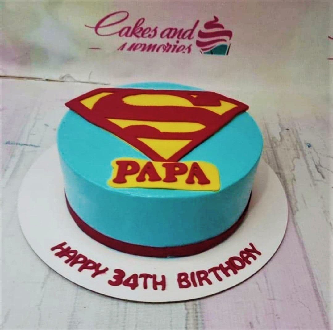 Superman themed blue birthday cake for Papa with a large red and yellow Superman logo and a personalized name plaque.