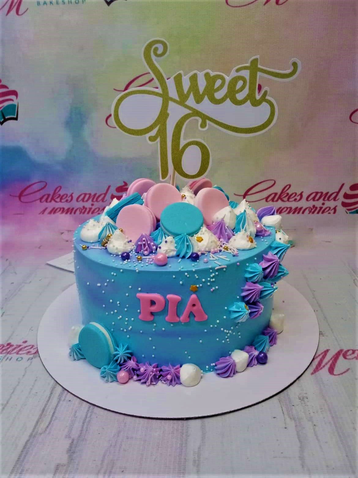 Light blue 1-tier Sweet 16 cake with pink and blue macarons, purple and blue icing rosettes, and a gold Sweet 16 topper.