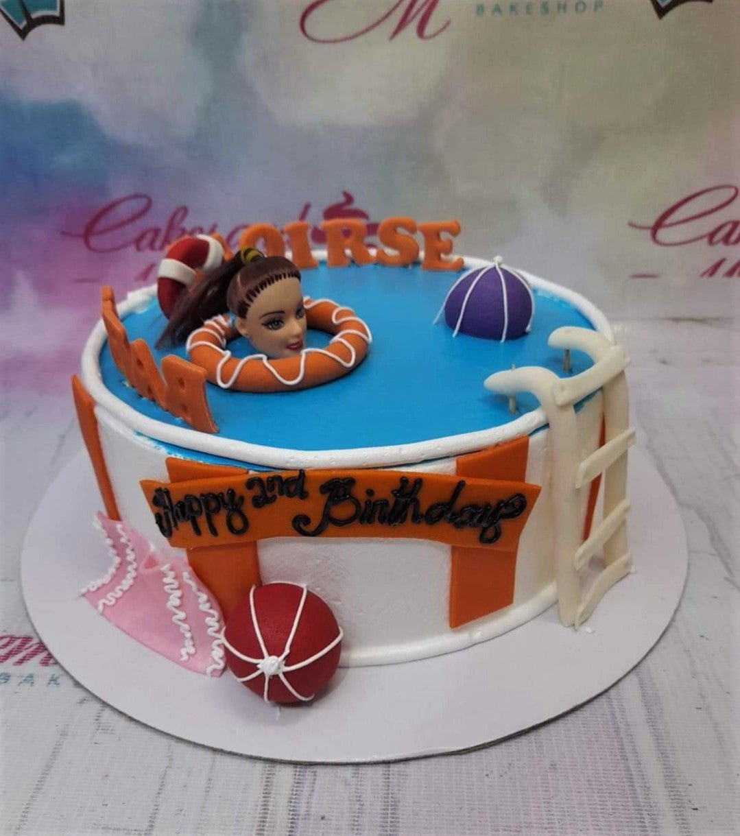 Swimming pool themed birthday cake with a Barbie head topper, lifebuoy, and beach balls on blue icing.