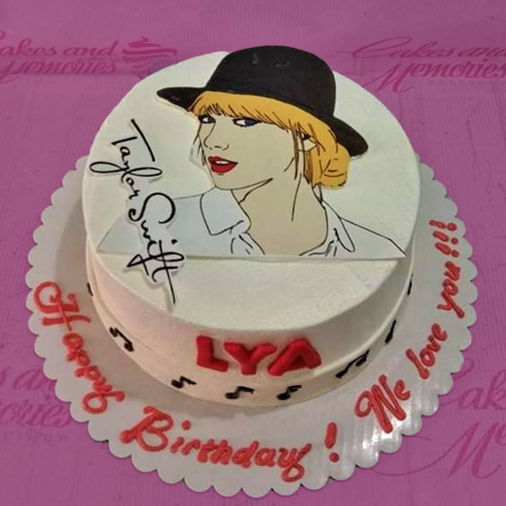 White round Taylor Swift themed birthday cake with a large character printout, red gumpaste letters, and black musical notes.