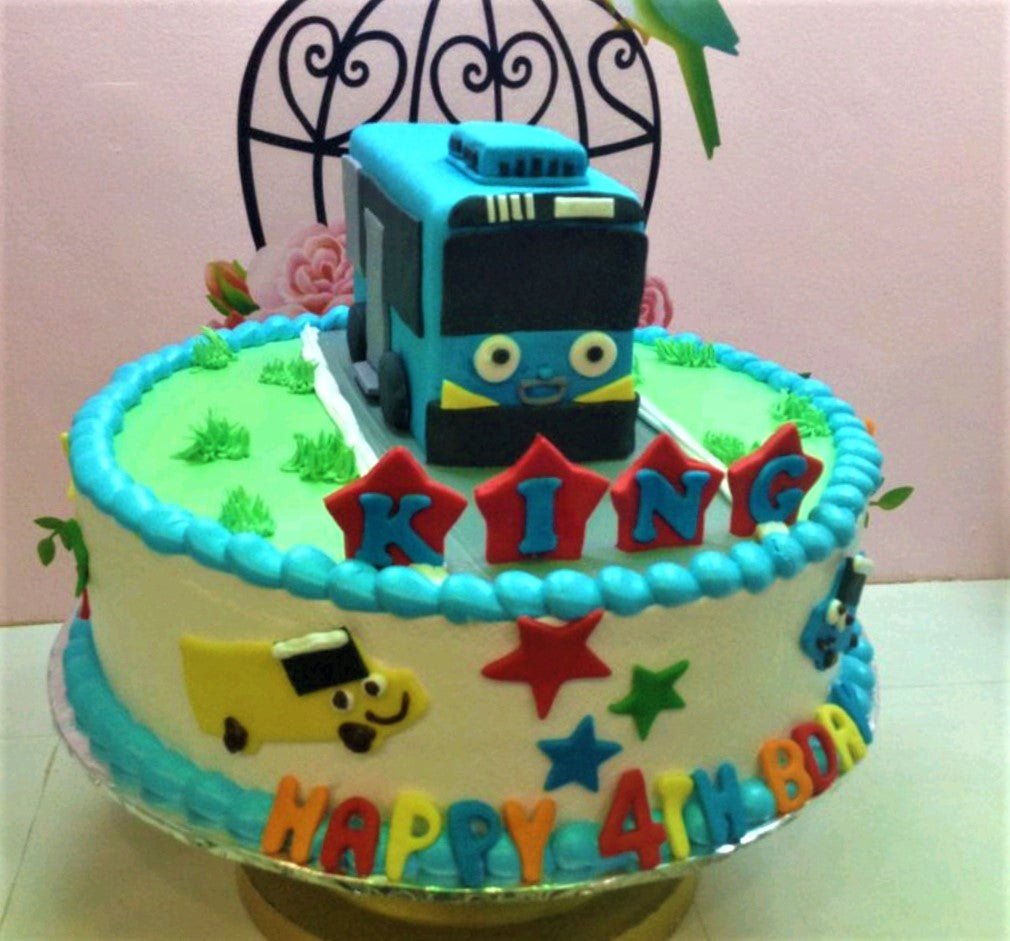 Tayo the Little Bus themed birthday cake with a 3D blue bus topper, green grass icing, and colorful gumpaste letters.