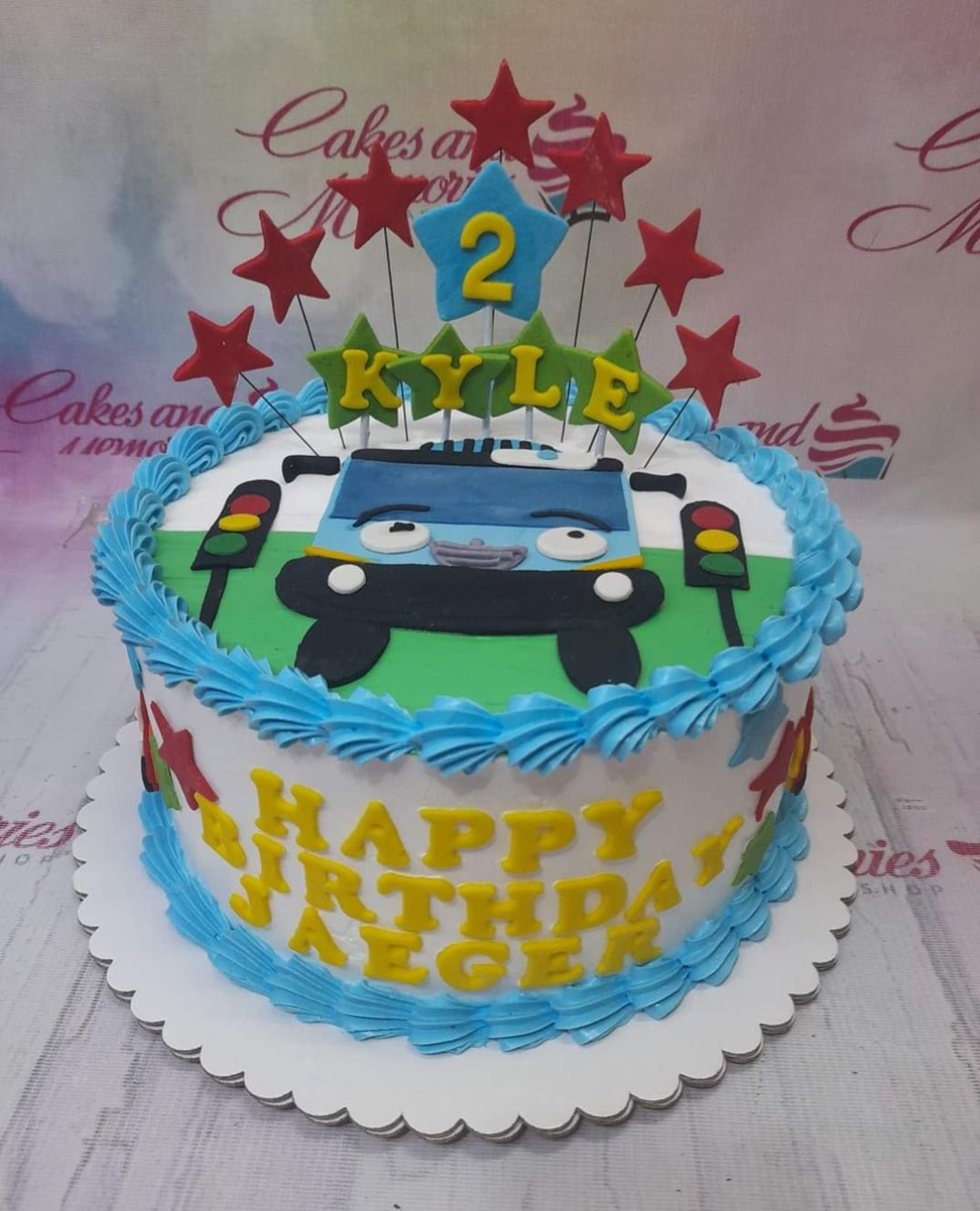 Tayo the Little Bus themed birthday cake with blue bus topper, red stars, and yellow gumpaste letters on a white and blue icing base.