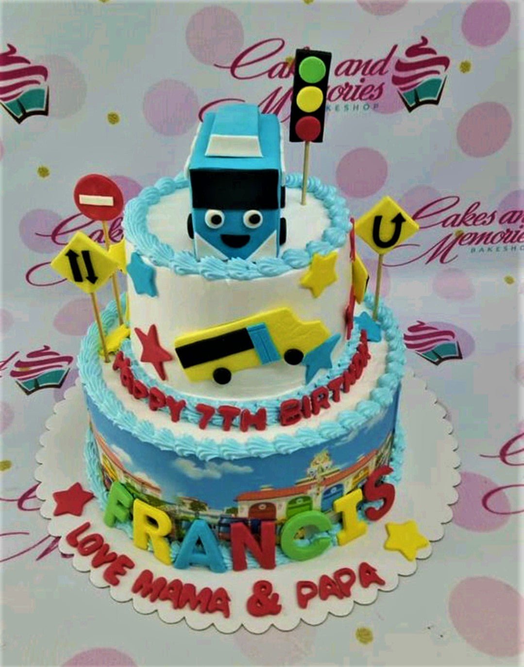 Two-tier blue and white Tayo the Little Bus themed birthday cake with traffic signs and fondant bus decorations.