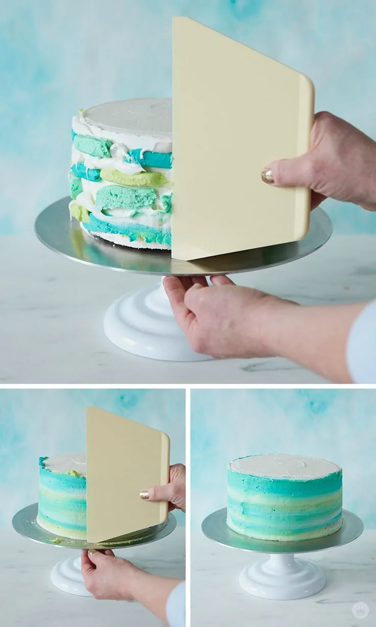 A single tier round cake with a white top and a textured gradient of teal, mint, and light green icing on the sides.