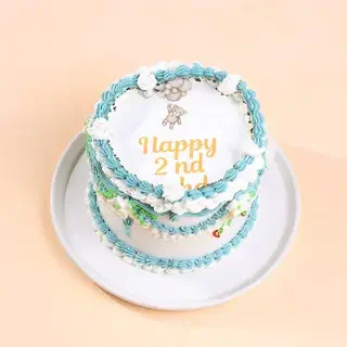 White vintage-style cake with blue and white icing ruffles, featuring a teddy bear printout and Happy 2nd Birthday message.