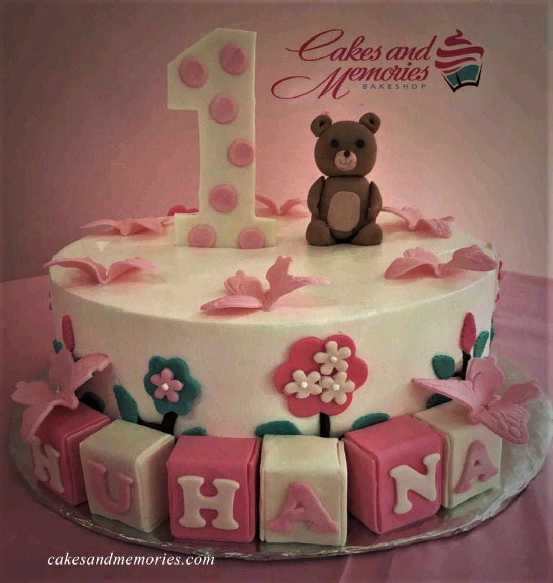 White fondant cake with a brown teddy bear topper, pink butterflies, and colorful gumpaste flowers and blocks.