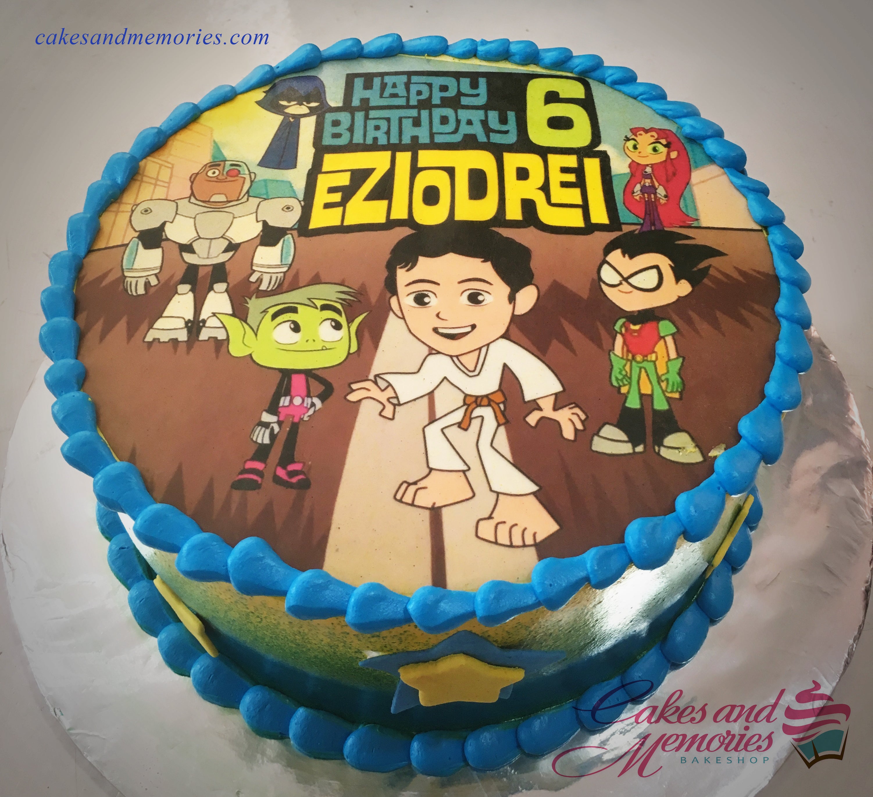 Teen Titans Go themed birthday cake with a custom printout of a boy in a karate gi and characters Robin, Beast Boy, Cyborg, Raven, and Starfire.