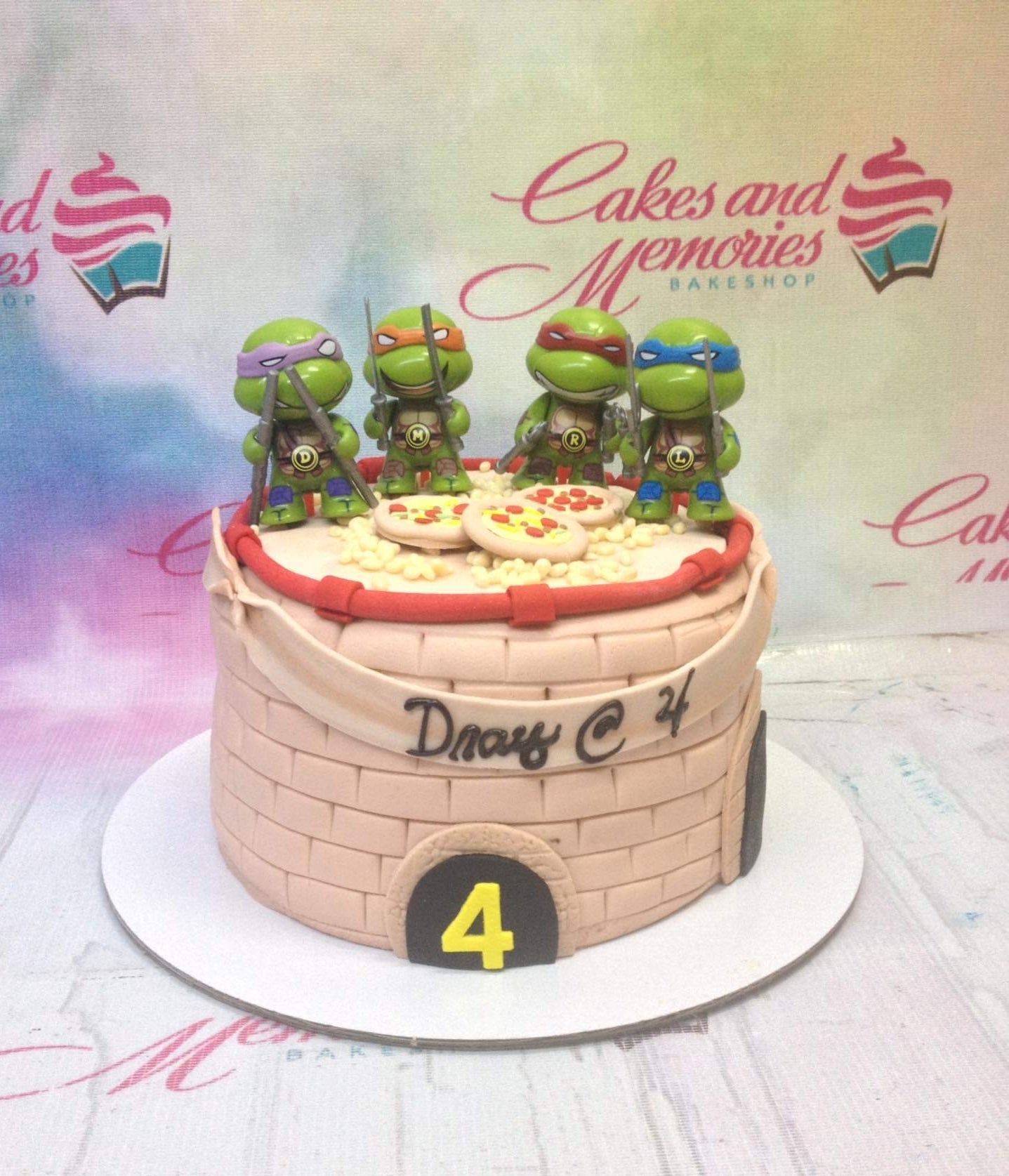 Teenage Mutant Ninja Turtles themed fondant cake with 3D character figures, pizza decorations, and a brick wall texture.