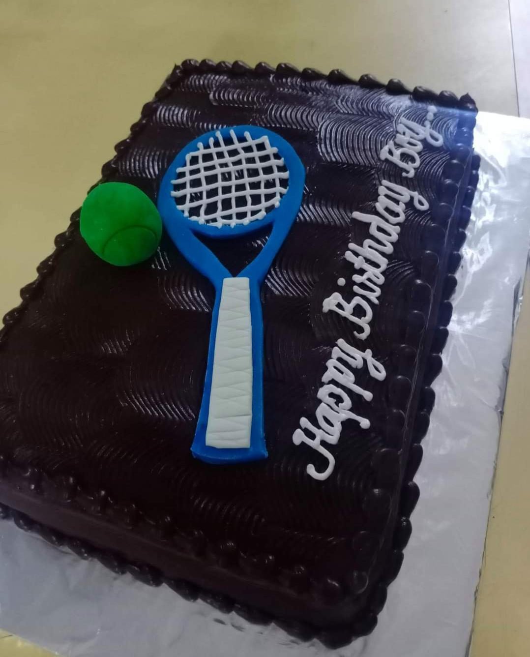 Chocolate rectangle cake with a blue fondant tennis racket and green tennis ball topper for a birthday celebration.