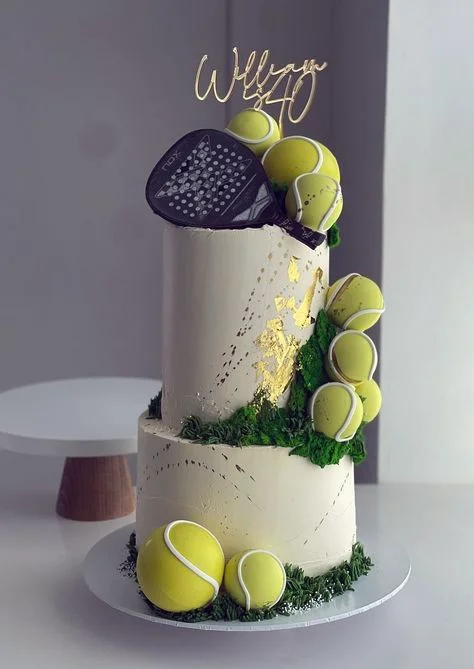 Elegant 2-tier tennis themed birthday cake in ivory with yellow tennis balls, green moss icing, and a gold William is 40 topper.
