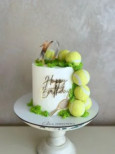 White tennis themed birthday cake with yellow tennis balls, green moss icing, and a gold Happy Birthday topper.