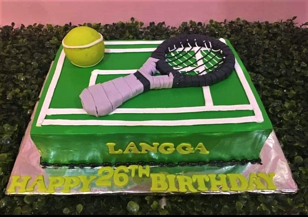 Green rectangle tennis court cake with a 3D fondant tennis racket and ball, featuring a birthday message on the side and base.
