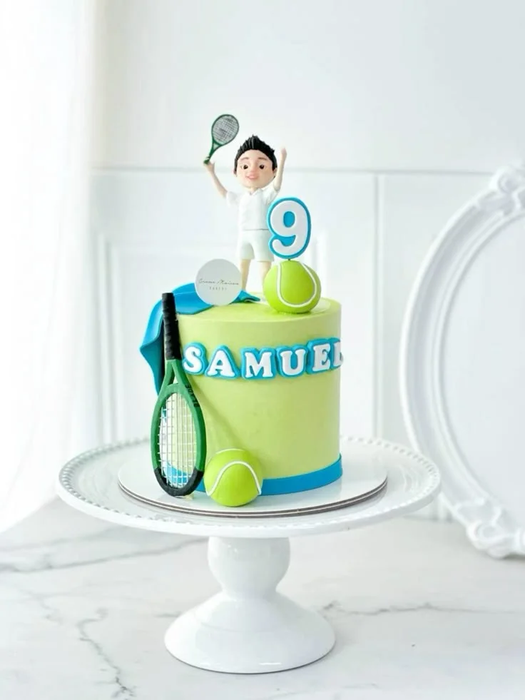 Light green tennis themed birthday cake with a 3D tennis player figure, tennis rackets, and balls for Samuel's 9th birthday.