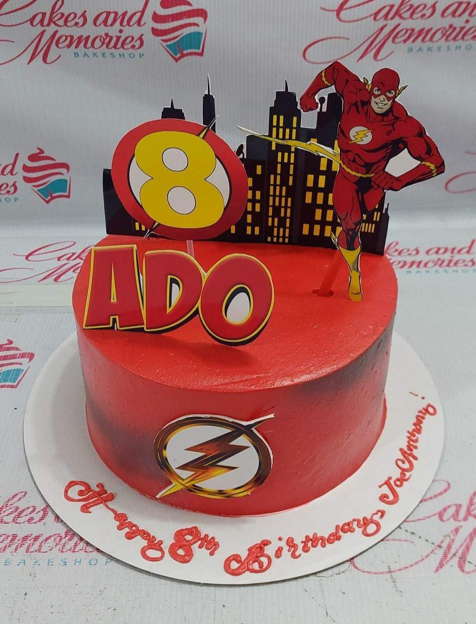 Red Flash superhero birthday cake with character printouts, city skyline backdrop, and lightning bolt logo.