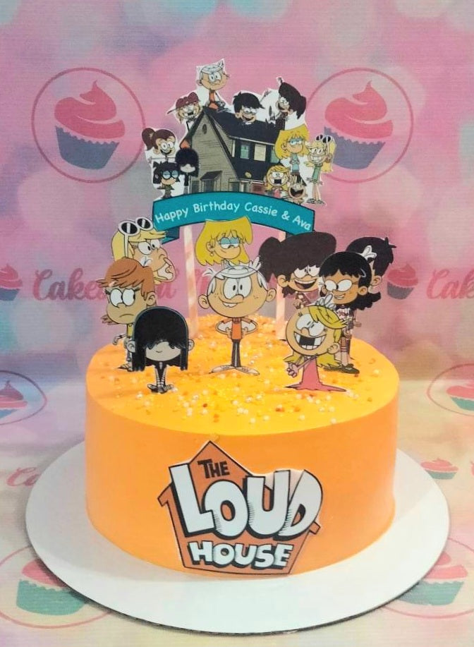 Orange 1-tier The Loud House themed birthday cake with character printouts and colorful sprinkles.