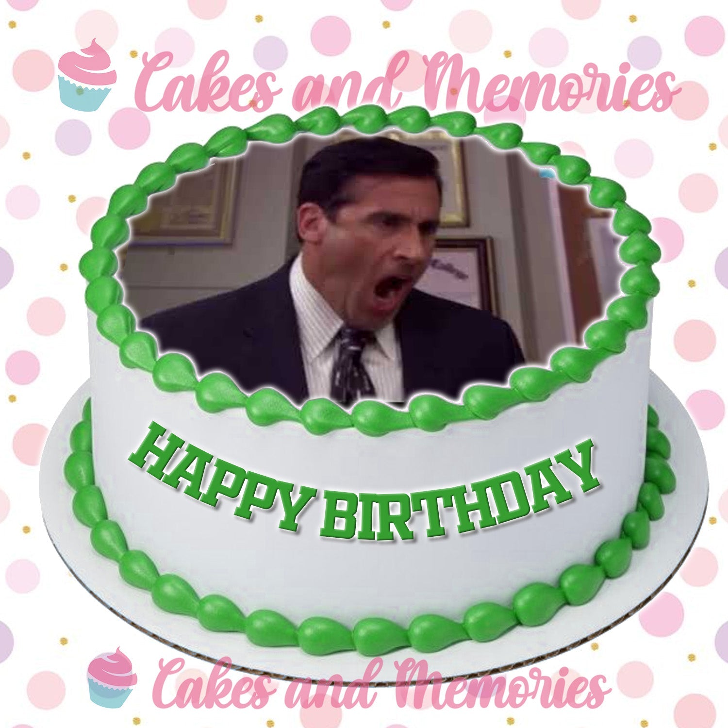 White round birthday cake with a funny Michael Scott printout topper and green icing borders.
