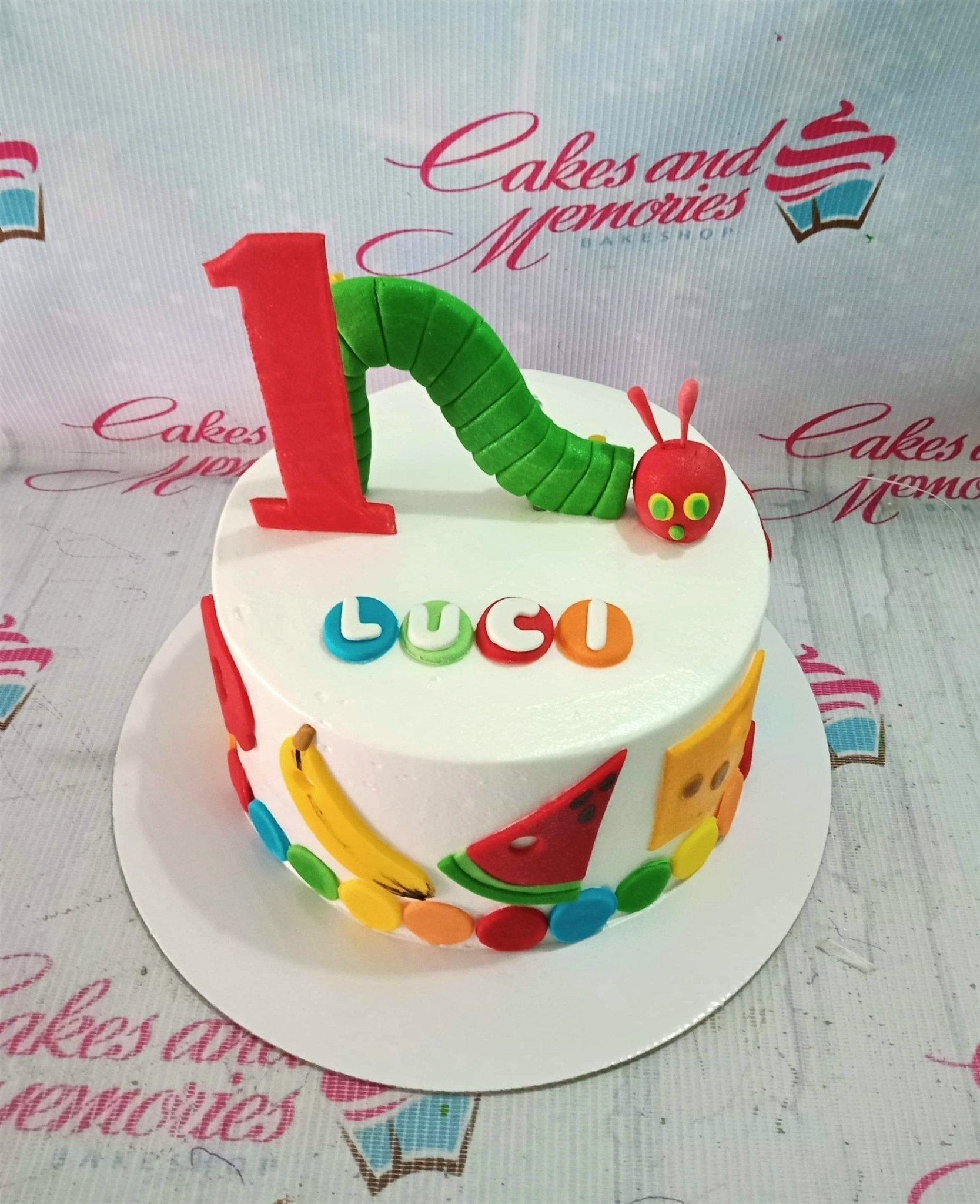 White 1-tier The Very Hungry Caterpillar birthday cake with a large red number one and fondant caterpillar topper.