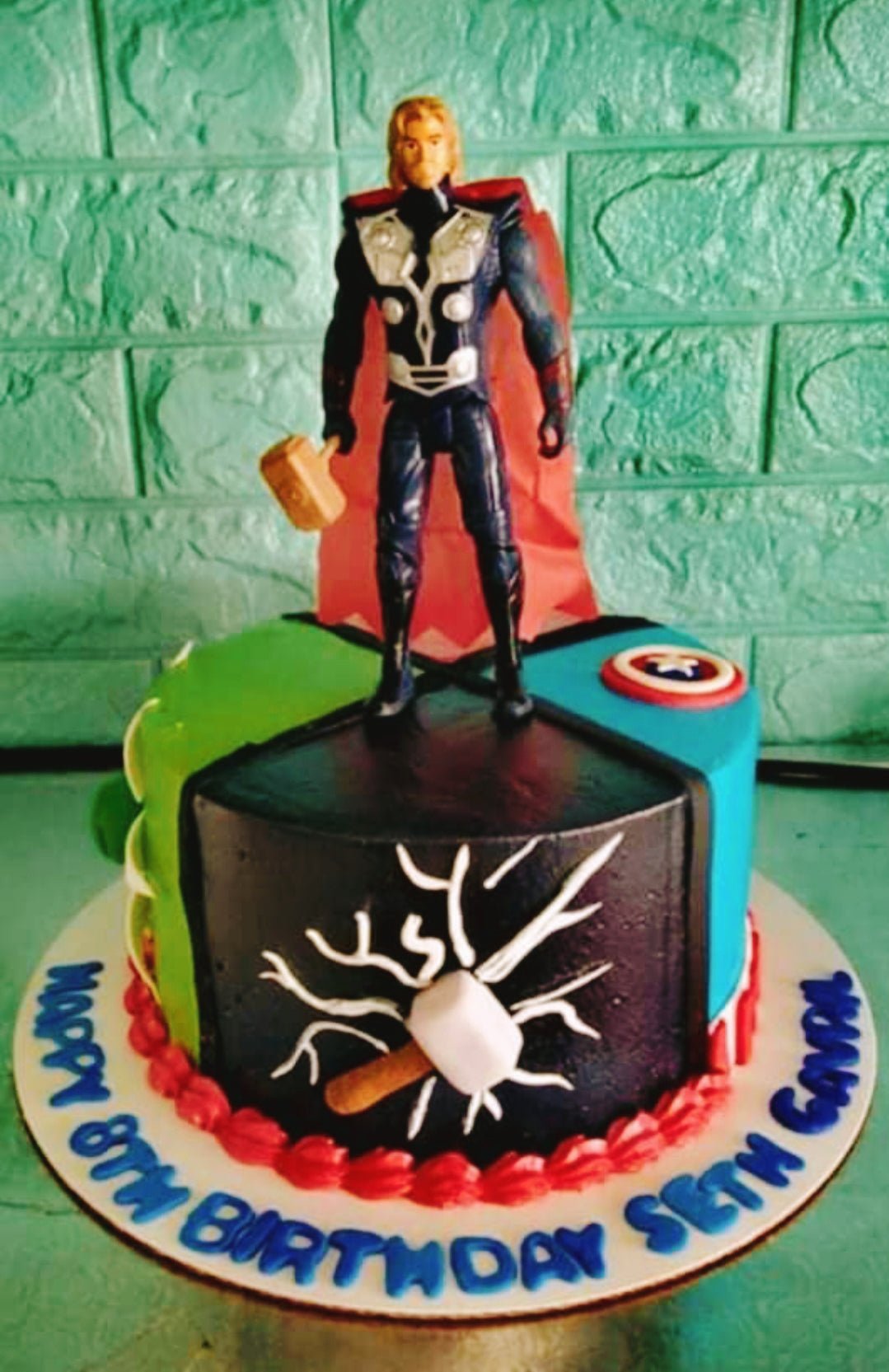 Avengers themed birthday cake featuring a Thor action figure on top and superhero symbols on the sides.