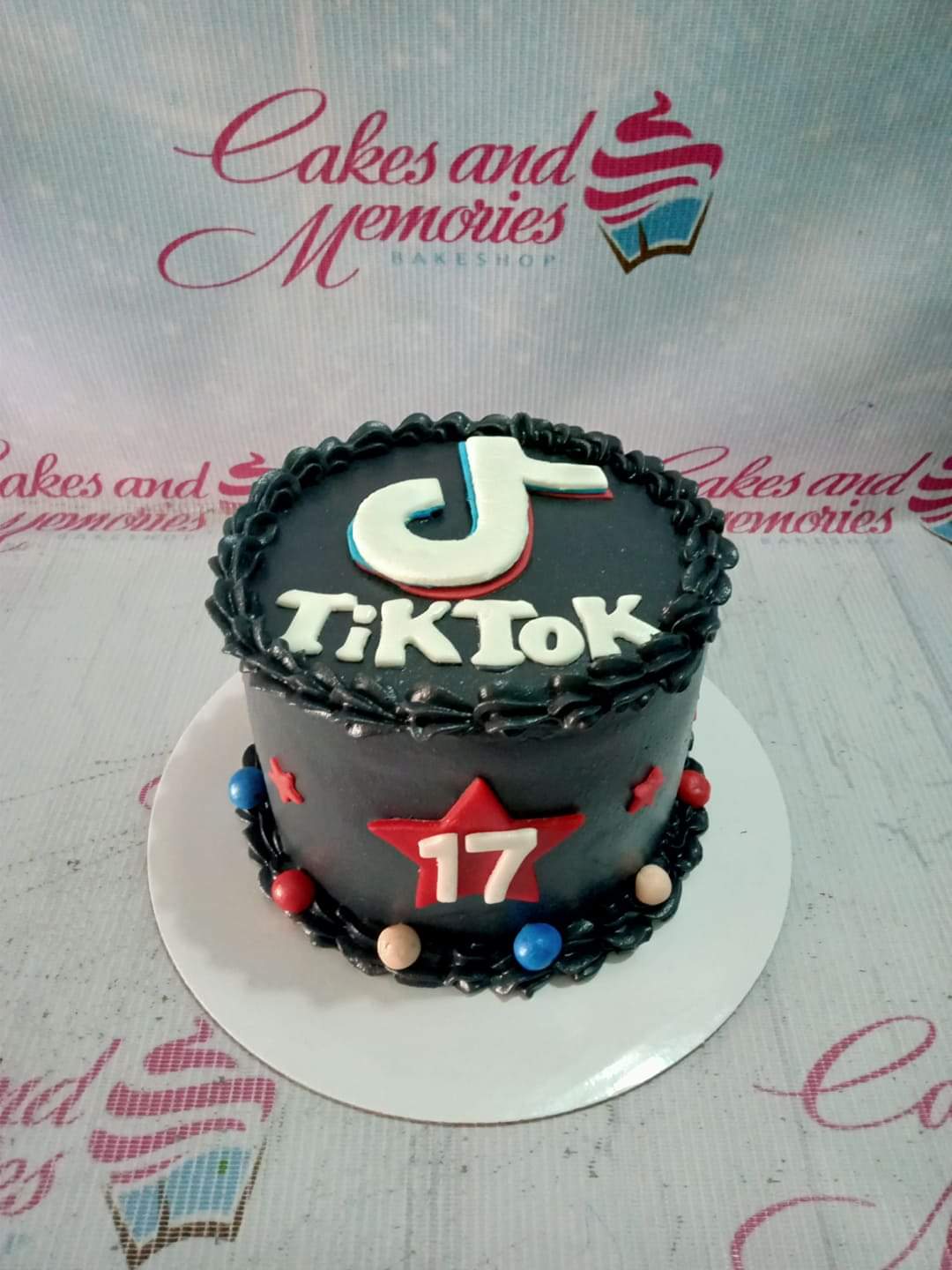 Black TikTok themed birthday cake with white logo and red star featuring the number 17