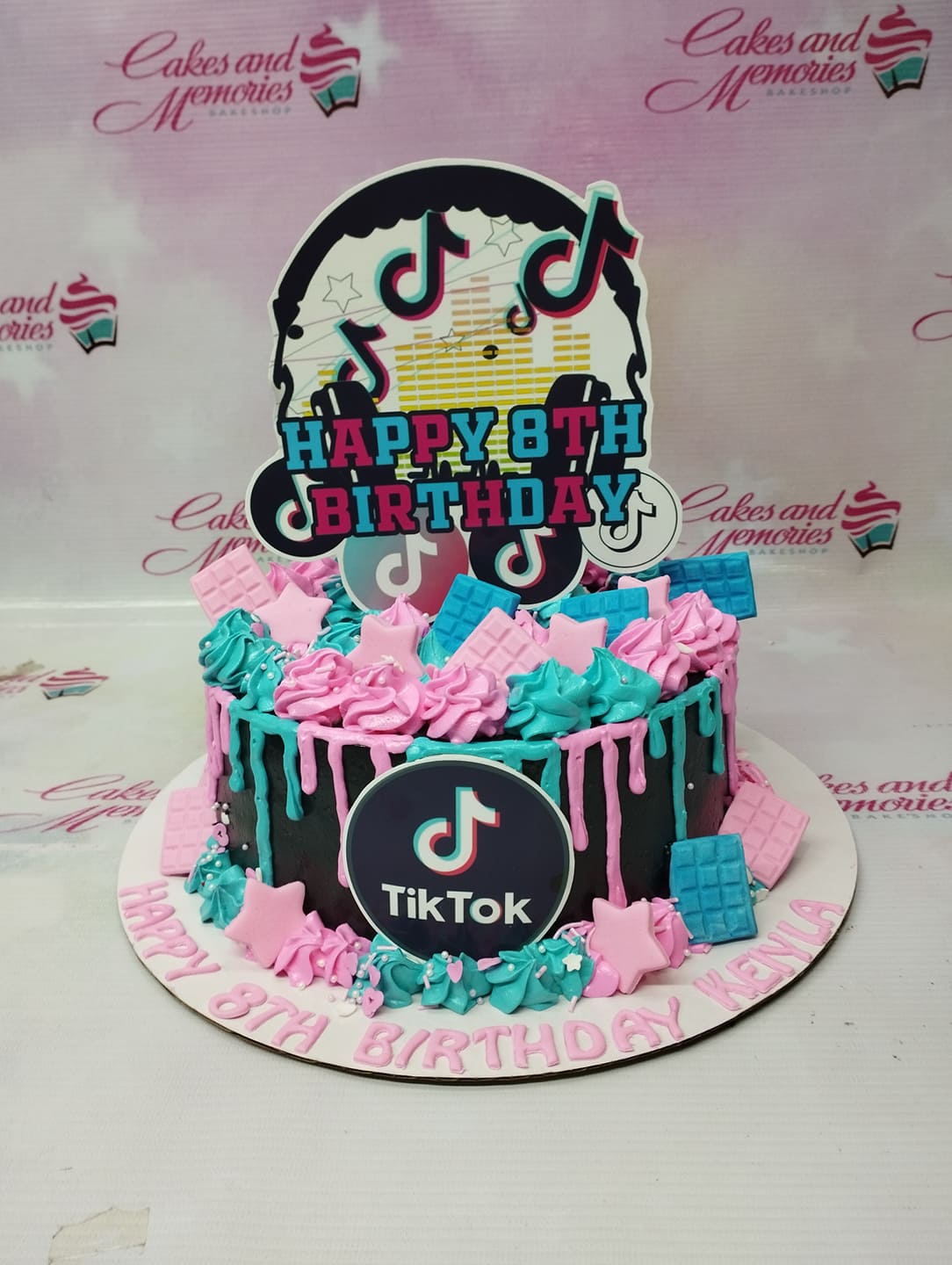 Black 1-tier TikTok themed birthday cake with pink and teal icing drips, chocolate bars, and stars.