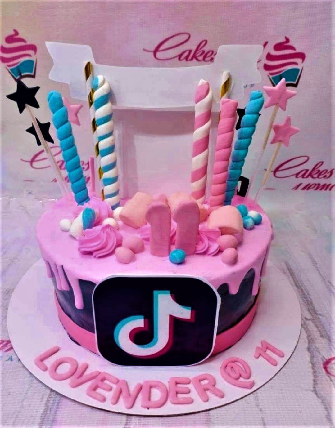 Pink and black TikTok themed cake with pink icing drip, marshmallow twists, and a large TikTok logo on the side.