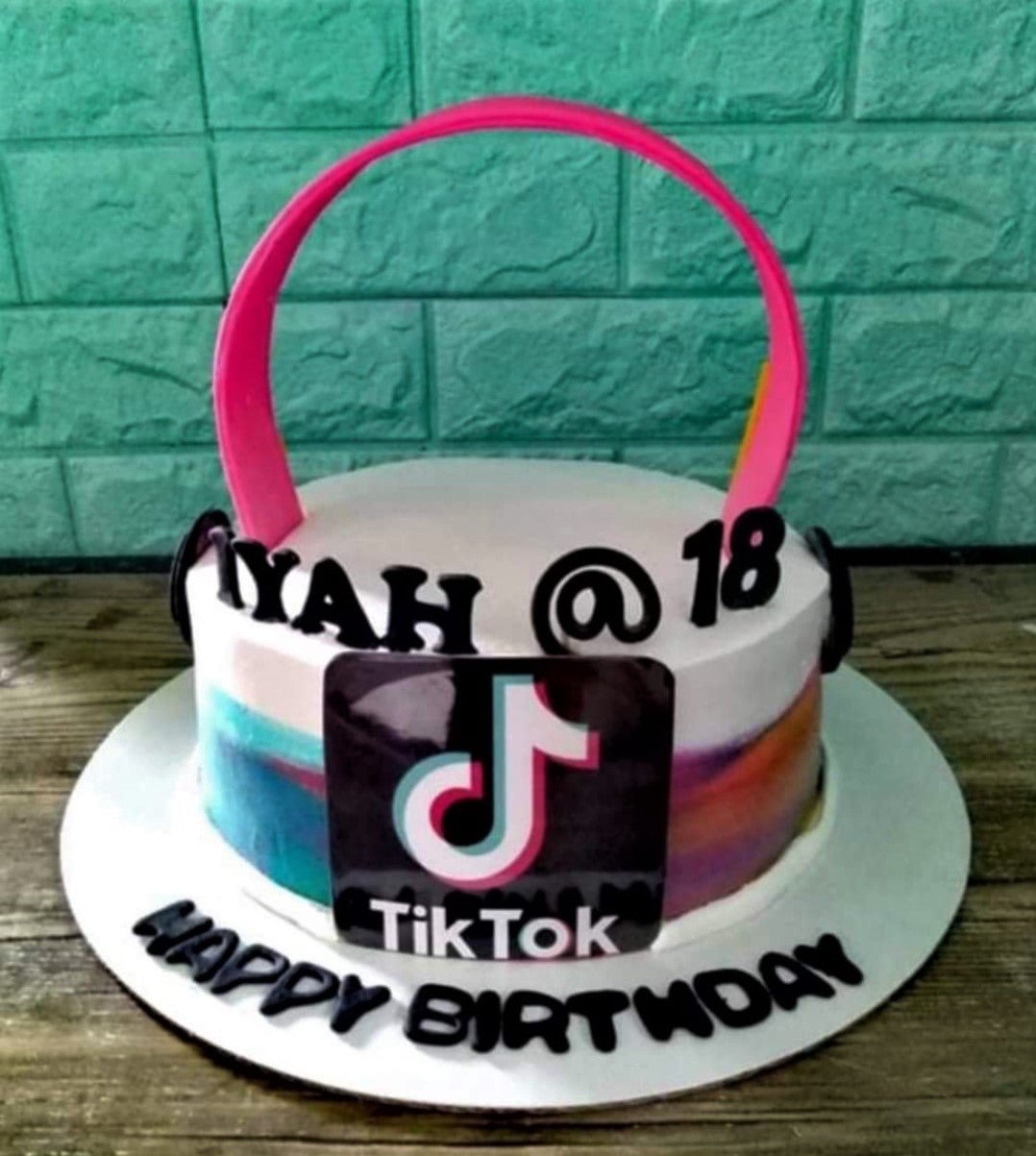 White 1-tier TikTok themed birthday cake with a pink headphone handle, TikTok logo printout, and black gumpaste letters.
