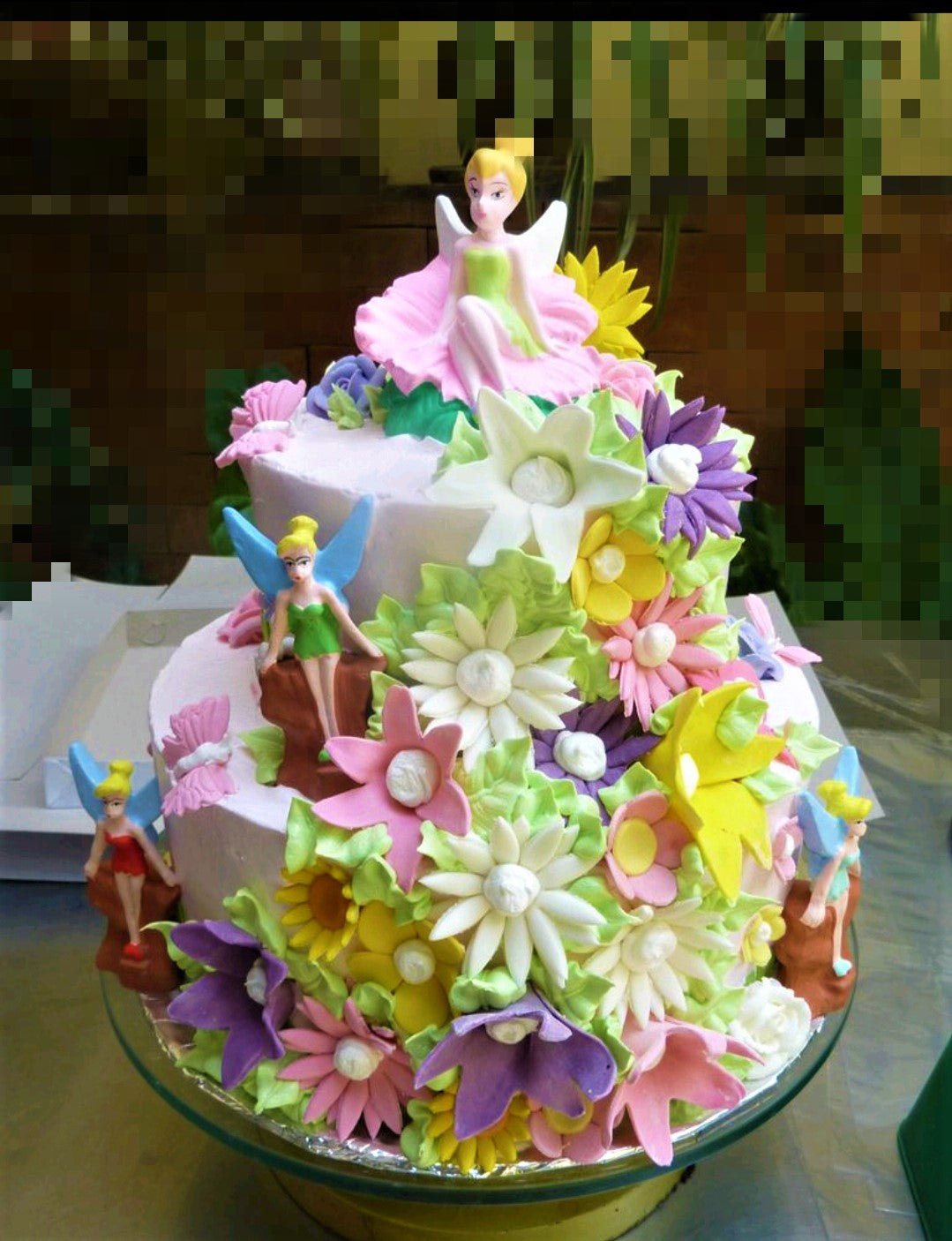 Two-tier pink Tinkerbell fairy cake covered in a dense garden of colorful gumpaste flowers and fairy figurines.