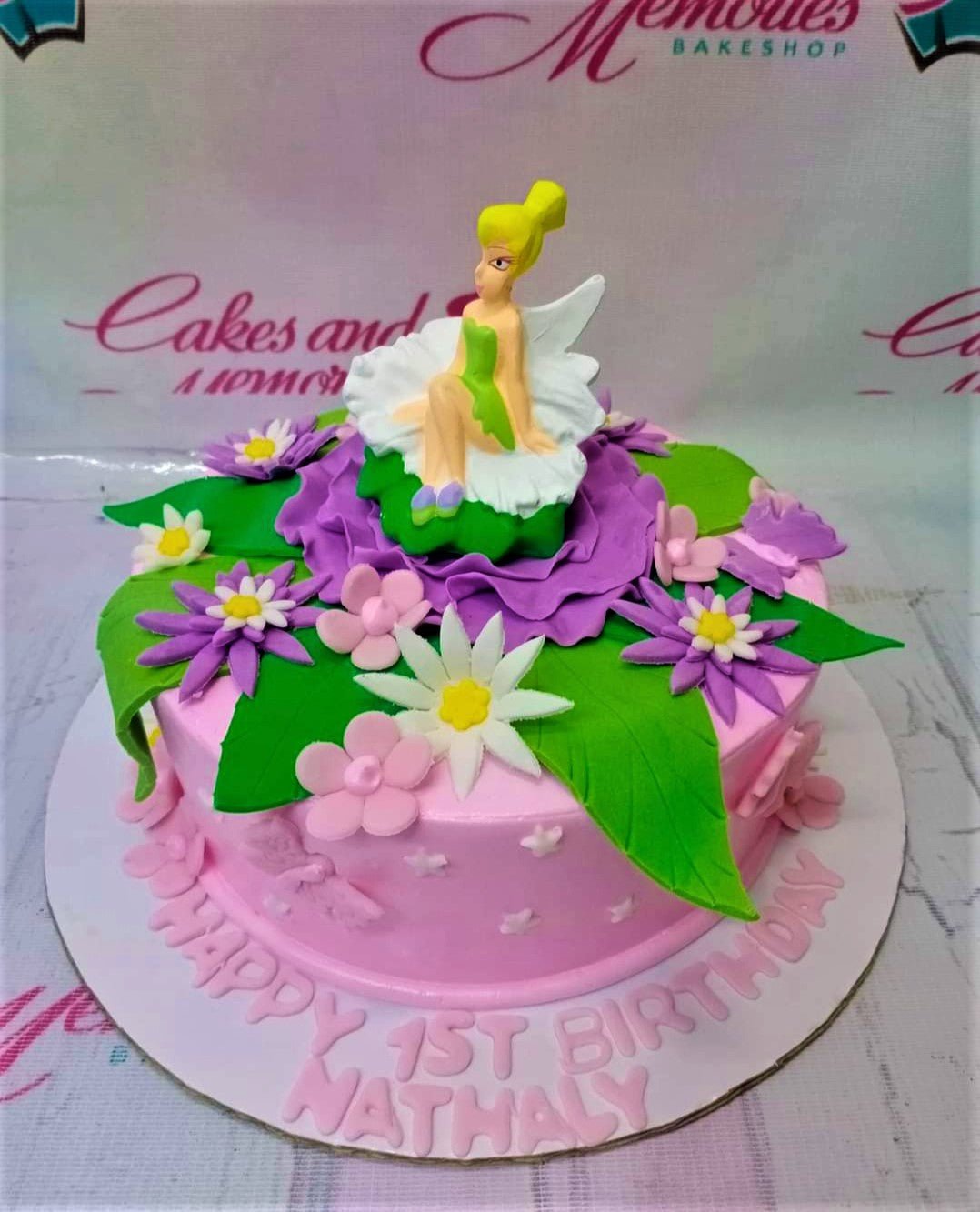 Pink Tinkerbell themed birthday cake with large green fondant leaves and purple and pink flowers.