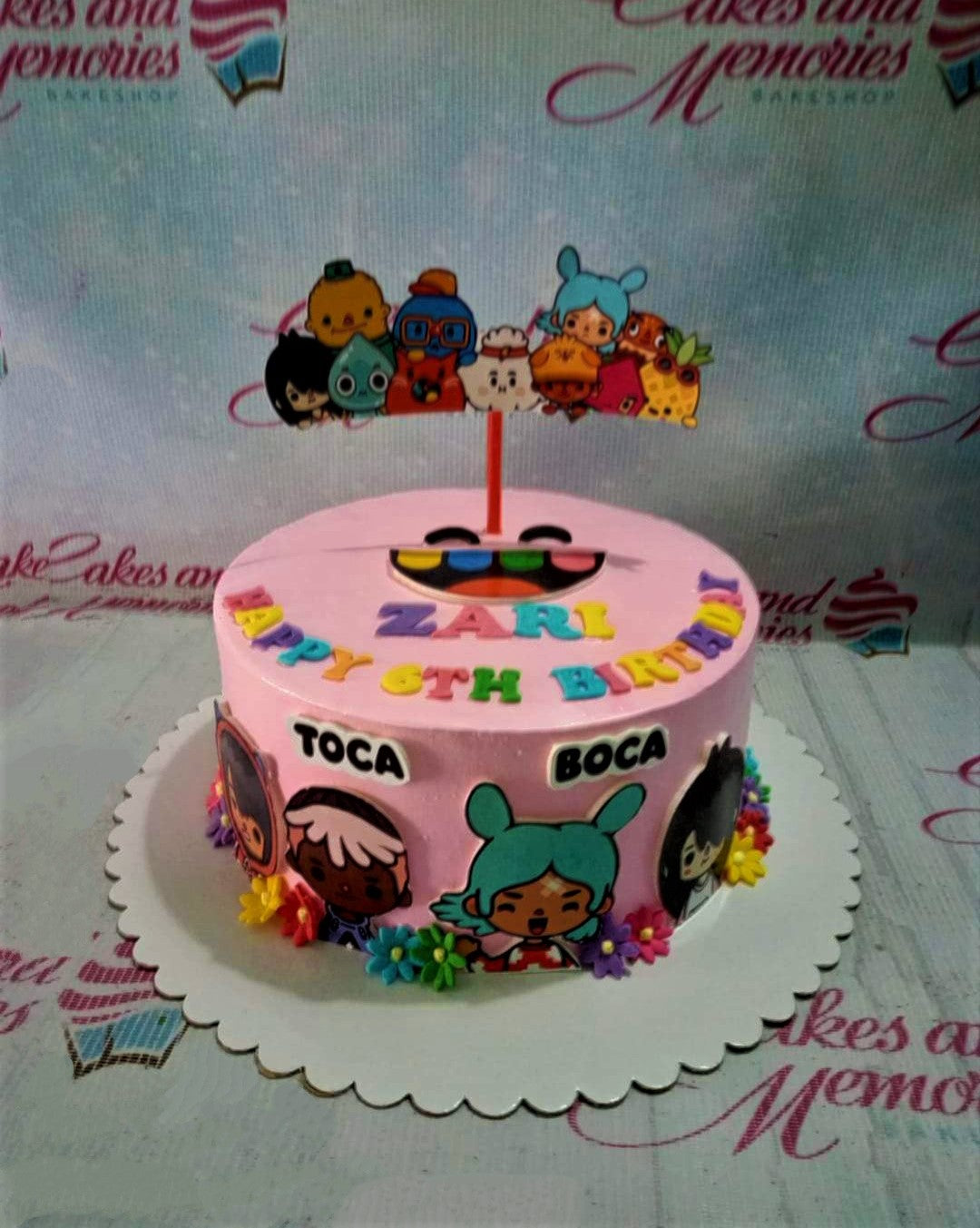 Pink Toca Boca themed birthday cake with colorful character printouts and gumpaste flowers.