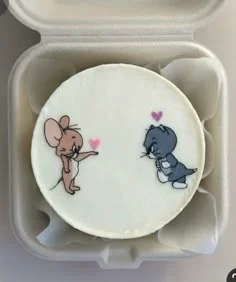 White bento cake featuring hand-drawn Tom and Jerry characters with pink hearts in a takeout container.