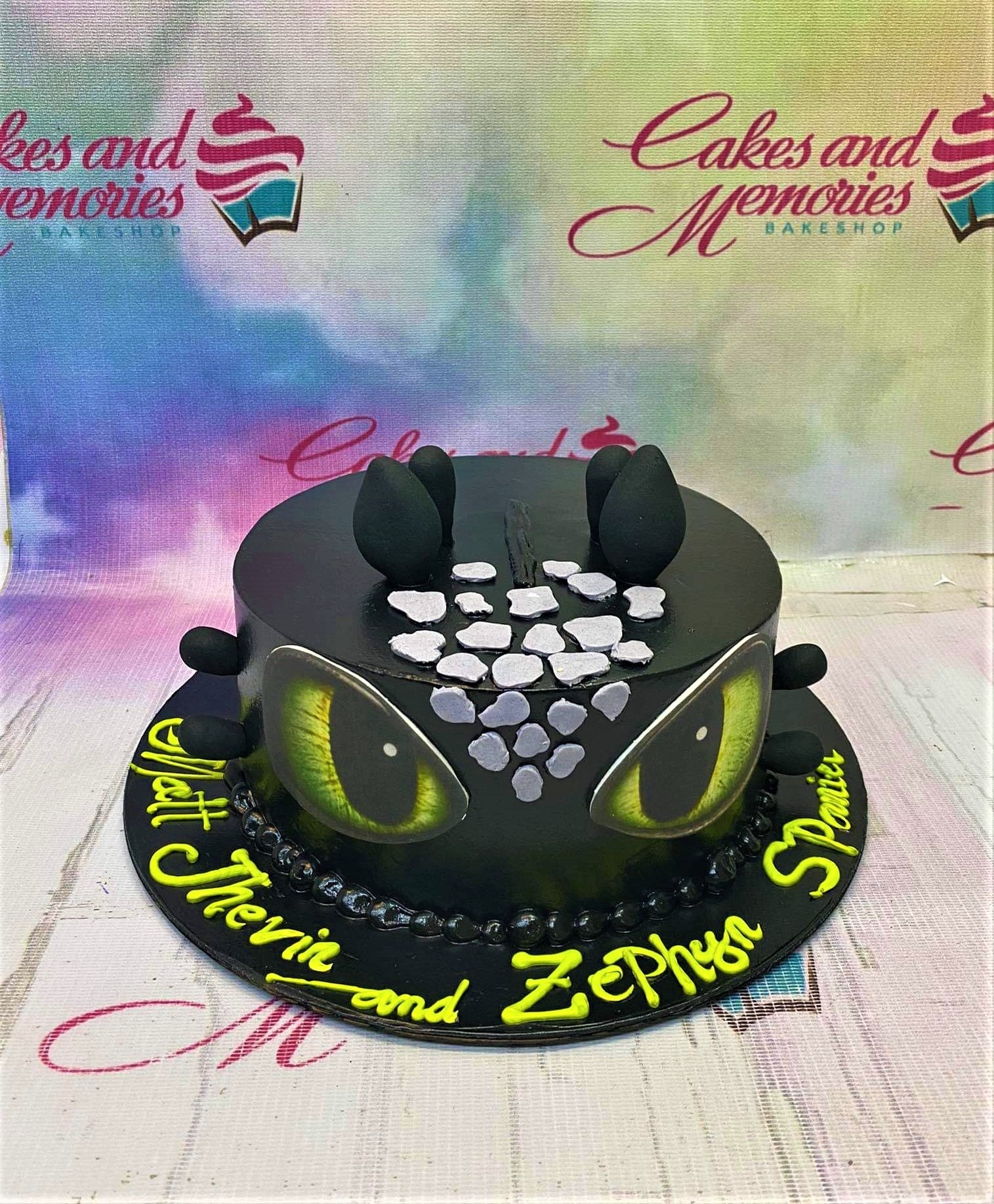 Black Toothless dragon cake with large green eyes and grey scales on a black base board with yellow icing text.