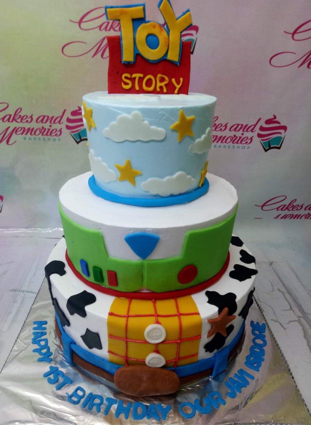 3-tier Toy Story themed fondant cake featuring Buzz Lightyear, Woody, and sky designs with a large Toy Story logo topper.
