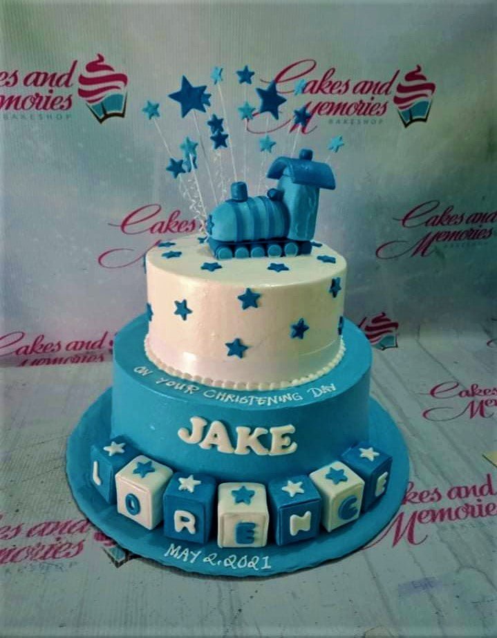 Blue and white 2-tier train themed christening cake with fondant stars and name blocks.