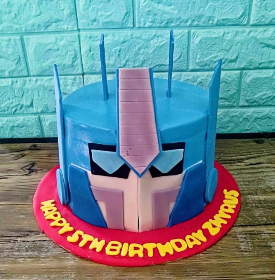 Optimus Prime Transformers themed blue fondant cake with 3D character face details and a red base board with yellow birthday message.