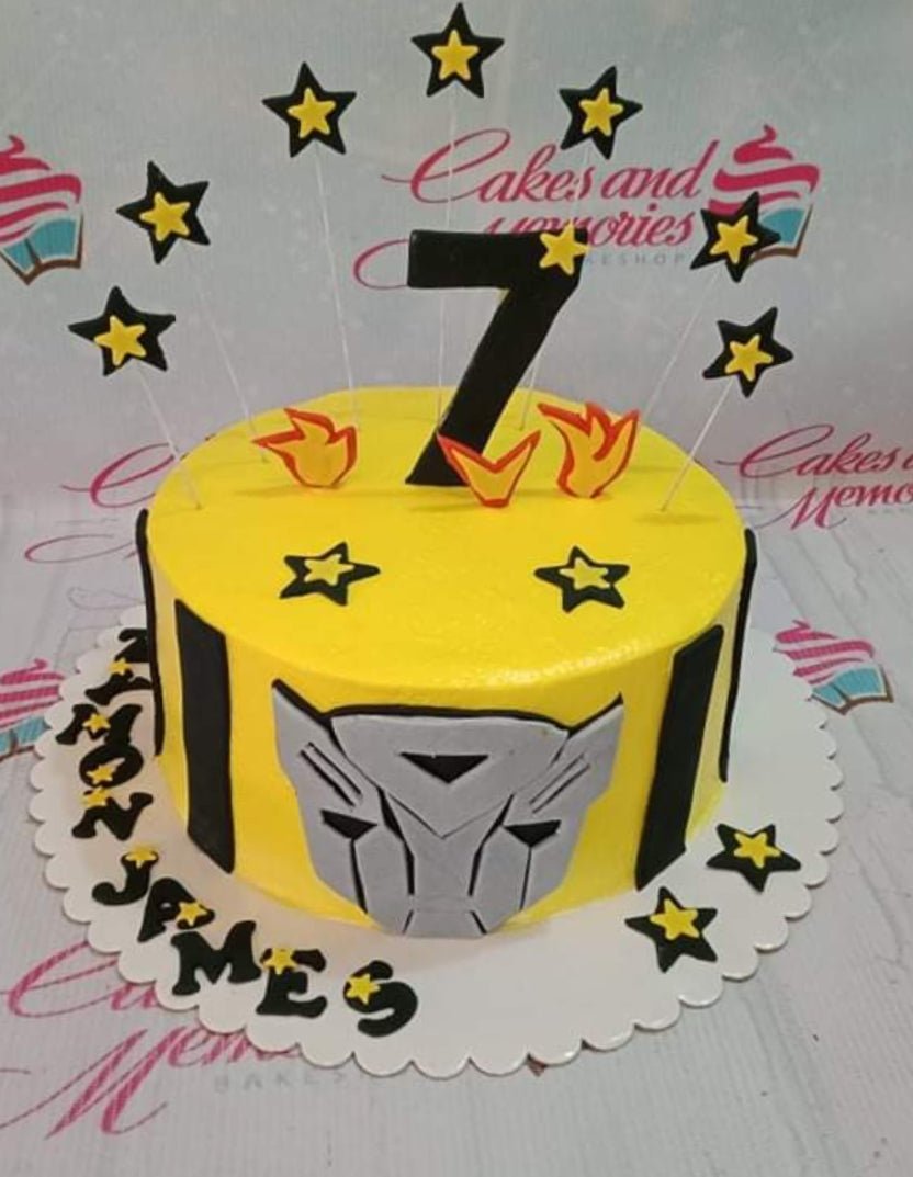 Yellow Transformers Bumblebee themed birthday cake with black stripes, grey robot face, and yellow stars on wires.